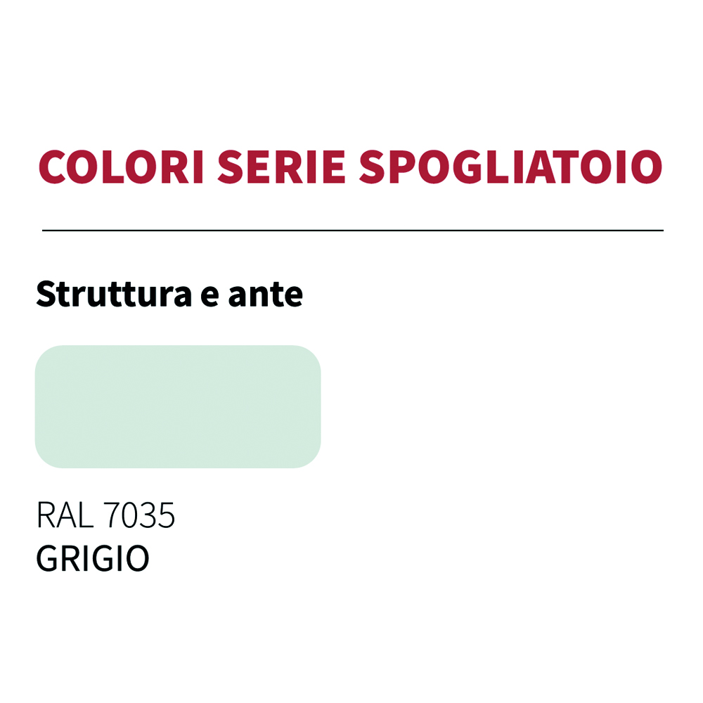 Base su piedi in acciaio, h. 120 mm. con inserti in plastica antiossidazione ,predisposti per inserimento piedino di regolazione a registrazione micrometrica in acciaio zincato con puntale in materiale plastico.Nervature di rinforzo atte ad accogliere lo zoccolo ad incastro.Corpo formato da pannellatura unica tra tetto e schiena unito tramite microgiunzione, a creare asole per l’aerazione e fianchi spessore frontale 30 mm.con bordi antitaglio piegati su tre ordini. Ante dotate di cerniere interne con perno di rotazione esterno a 180 °,canottatura di rinforzo sul lato cerniere e pieghe antitaglio su tre ordini sui lati rimanenti,feritoie di aerazione superiori ed inferiori,portacartellino stampato. Chiusura Leva ad una via. Allestimento interno interno vuoto Dimensioni ingresso utile cm. 27 x 37 H