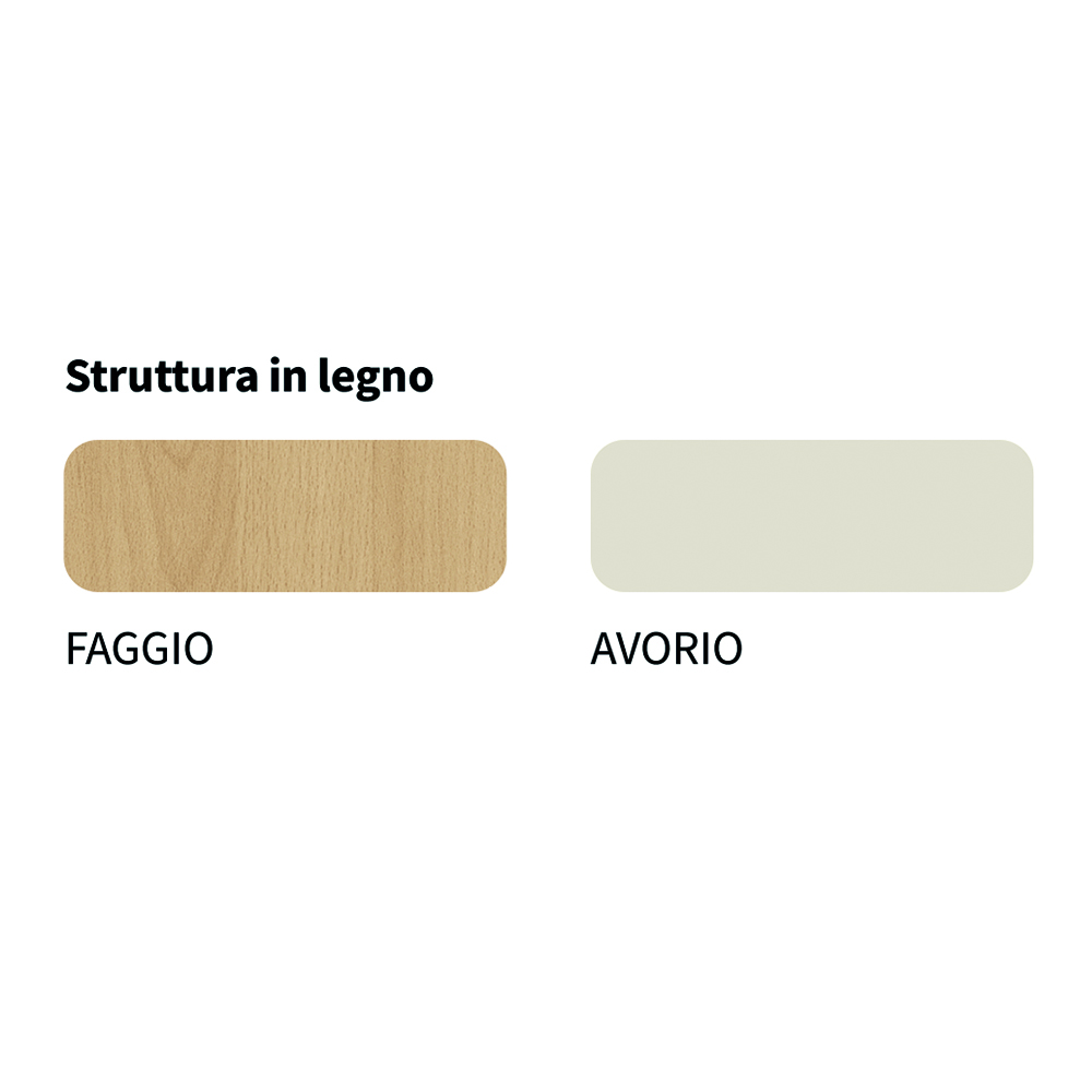 Struttura in truciolare nobilitato spessore minimo mm 18 con bordi in ABS spessore mm 2. Ogni vano interno contiene 2 ripiani fissi e 3 ripiani spostabili in truciolare nobilitato spessore minimo mm 18 fissati alla struttura per mezzo di appositi ganci in plastica antiribaltamento. Schienale in truciolare nobilitato classe E1, spessore mm 8. Piedini di appoggio a terra in materiale plastico diametro mm 50x28h dotato di sistema di livellamento.