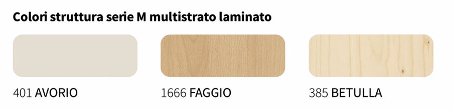 Struttura in nobilitato. Il sistema di assemblaggio avviene con spine in legno eccentrici in metallo ed in plastica.